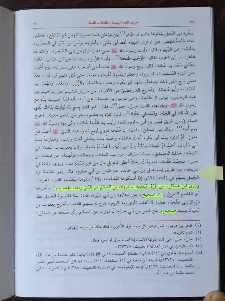 اور یعقوب بن سفیان صحیح سند کے ساتھ قیس بن ابو حازم سے روایت کرتے ہیں کہ مروان بن حکم نے لشکر کی طرف نگاہ اٹھا کر دیکھا تو کہنے لگا : اس ( طلحہ) نے عثمان کے قتل میں اعانت کی تھی ، پھر تیر پھینک کر آپ کو زخمی کر دیا ، جس سے مسلسل خون جاری رہا حتی کہ آپ وصال فرما گئے ۔