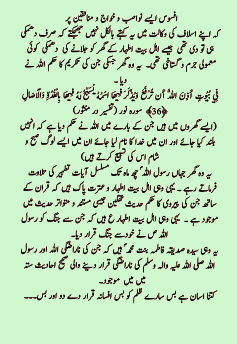 یہ کونسی شریعت اور خلافت تھی کہ جو رسول خدا (ص) کے گھر کو آگ لگانے سے محکم اور استوار ہوتی ہے اور کیا خود رسول خدا نے اسی دین اور شریعت کو محکم اور استوار کرنے کے لیے کفار اور مشرکین کے گھروں کو بھی آگ لگائی تھی ؟؟؟ !!!