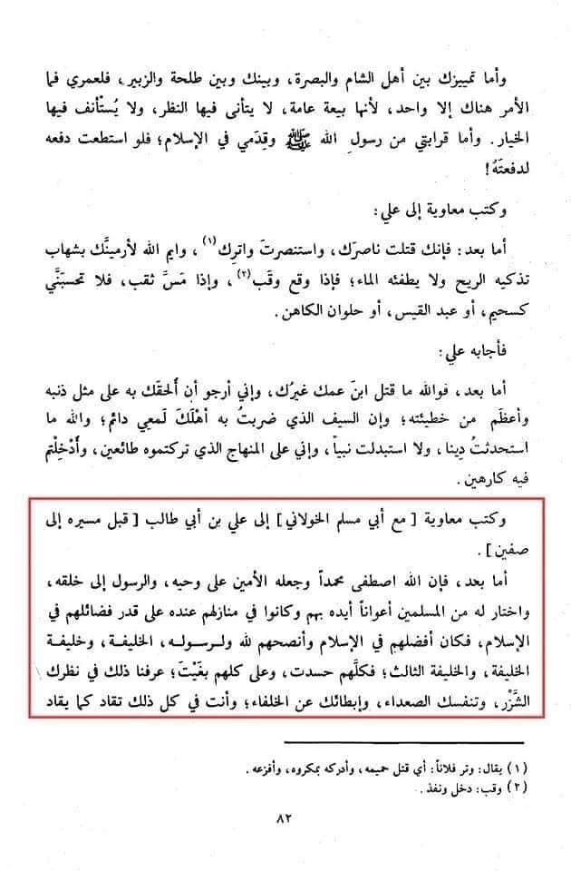 امابعد خدا نے حضزت محمدﷺ کو چُنا اور اپنی وحی کا امین بنایا اور اپنی مخلوق کی طرف رسول بنا کر بھیجا اور مسلمانوں میں سے اس کے مددگار بنا کر نبیﷺ کی تائید کی ، اور ان کی منزلت نبیﷺ کے هاں ان کی اسلامی فضیلت کے اعتبار سے تھی۔ ان میں زیادہ افضل رسولﷺ ان کا خلیفه، خلیفے کا خلیفه اور تیسرا خلیفه تھے۔ تم (علی) نے ان تینوں خلیفوں سے حسد کیا اور ان سے بغاوت کی اور هم یے سب اس لیے جانتے هیں کے تمھاری نگاهیں ان کی طرف غضبناک تھیں اور ان پر تمھارا پھنکارنا اور خلفاء سےگریزاں هونا۔ اور اس درمیان تم نکیل ڈالے کسی اونٹ کی طرح کھینچے گیۓ یہاں تک که تم نے بیعت کر لی جبکه تم انکار کرتے رهے اور تم نے دوسروں سے زیاده عثمان سے حسد کیا۔۔۔۔۔
